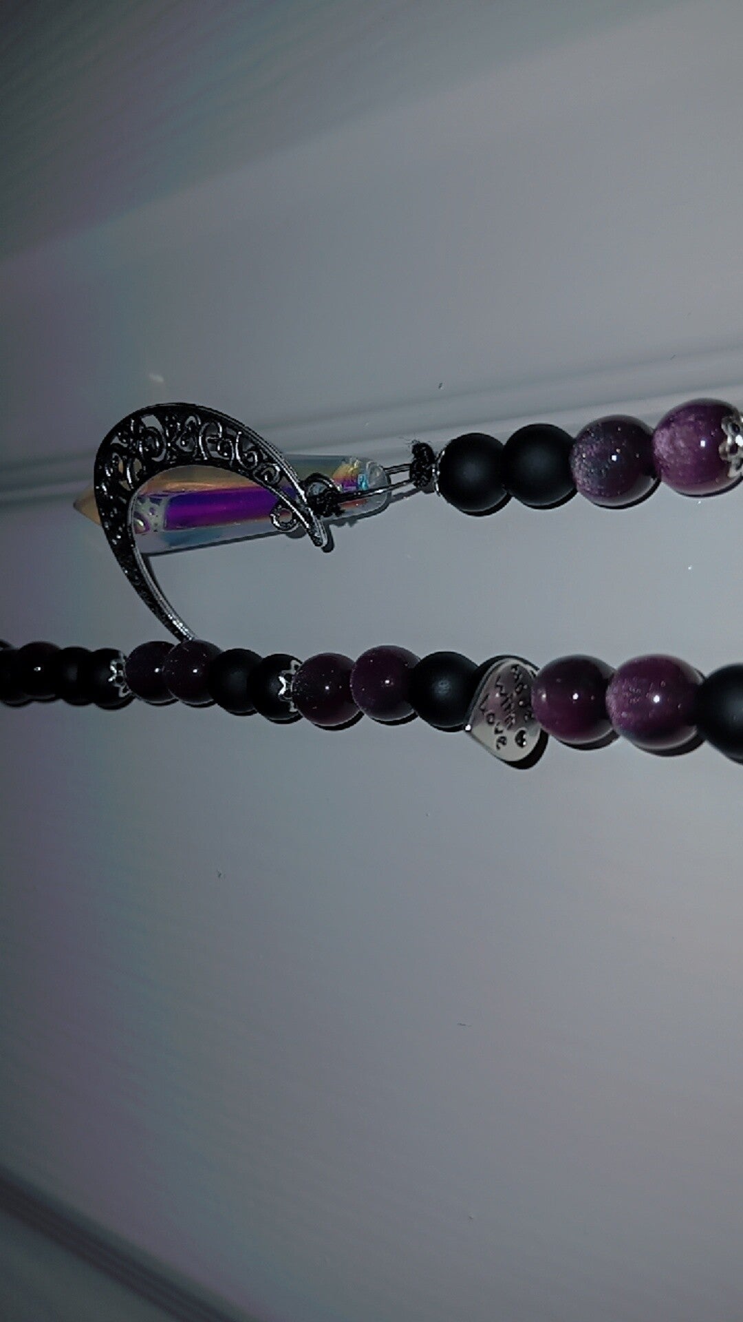 Bracelet: pink and black beads with black trinkets with small gems and a pentegram in the middle.