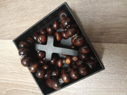 Beautiful wooden necklace with brown wooden beads,wooden cross, silver trinkets, a love heart and black threading.