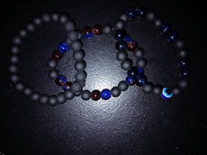 One dark blue and black beads with a evil eye in the middle.