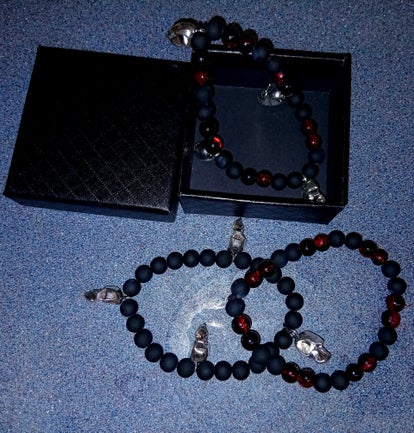 Black and red bracelets.