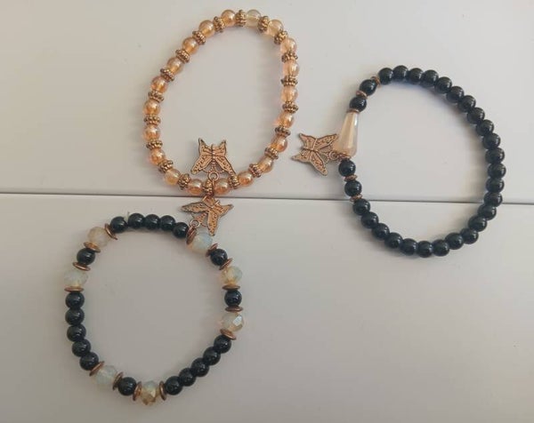 One balck with white/seethrough beads, gold trinkets and a gold butterfly white thread.