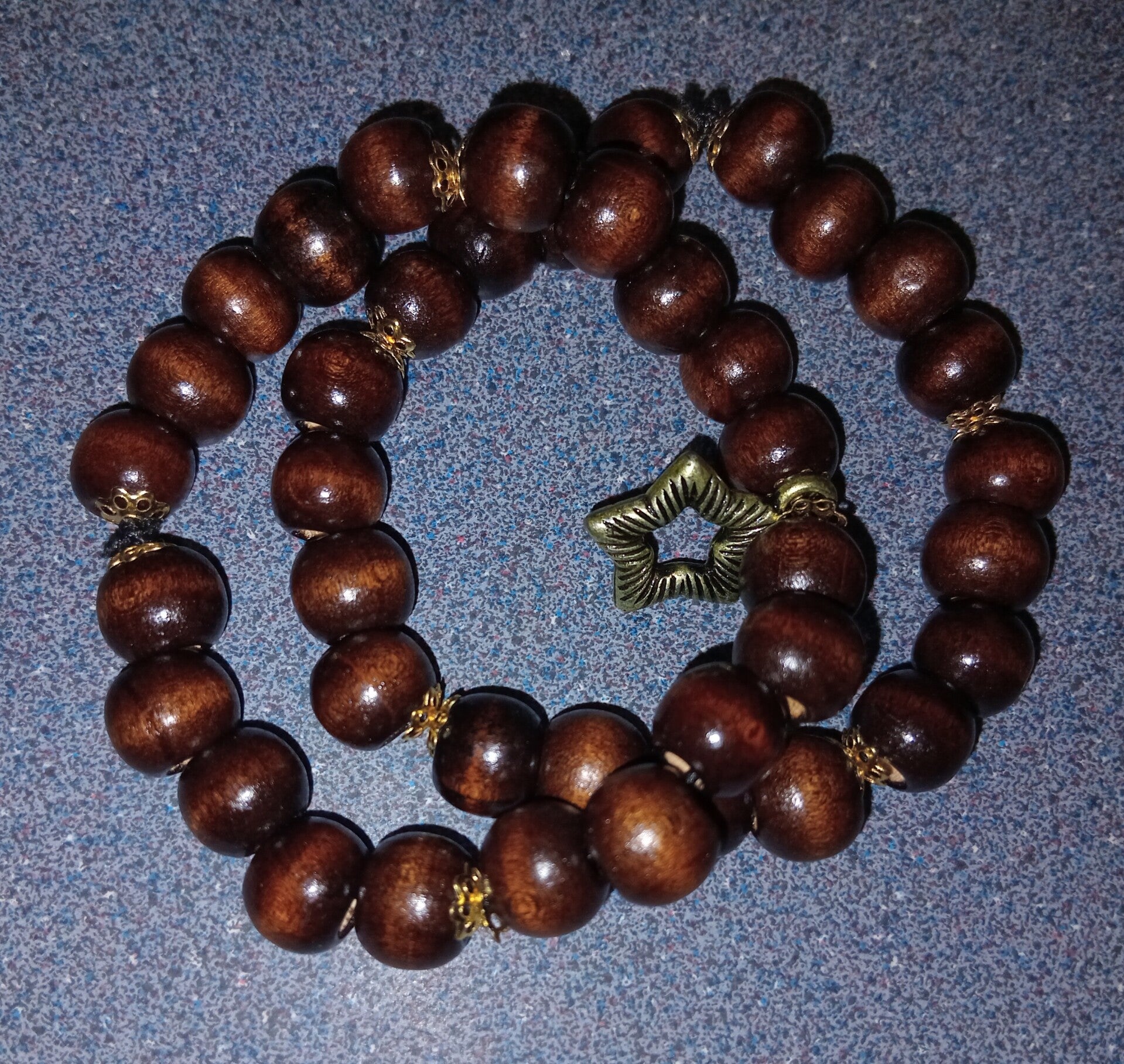 One with wooden beads, gold flowery trinkets and a gold star in the middle.