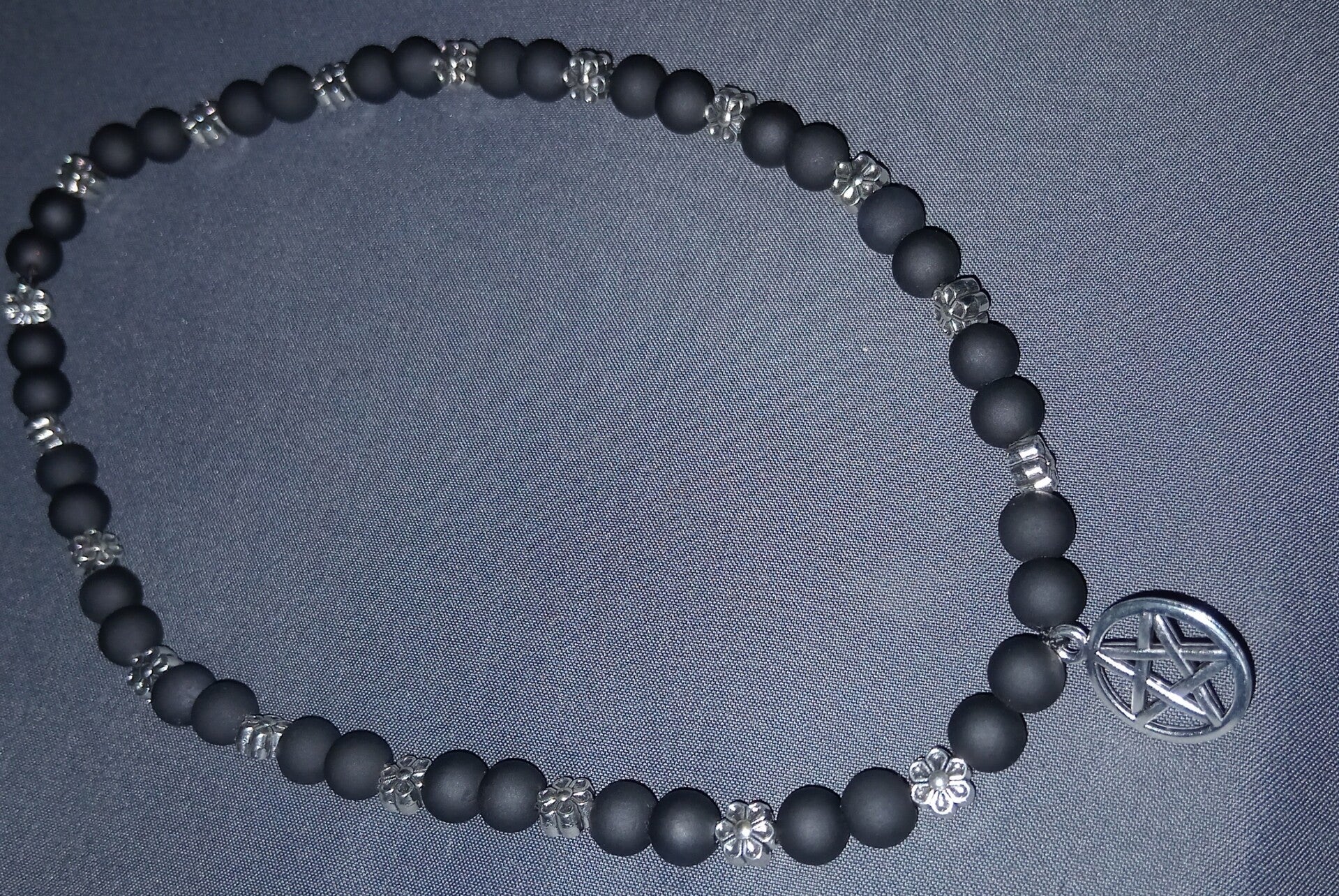Necklace: black beads with silver flowers and a pentagram in the middle.