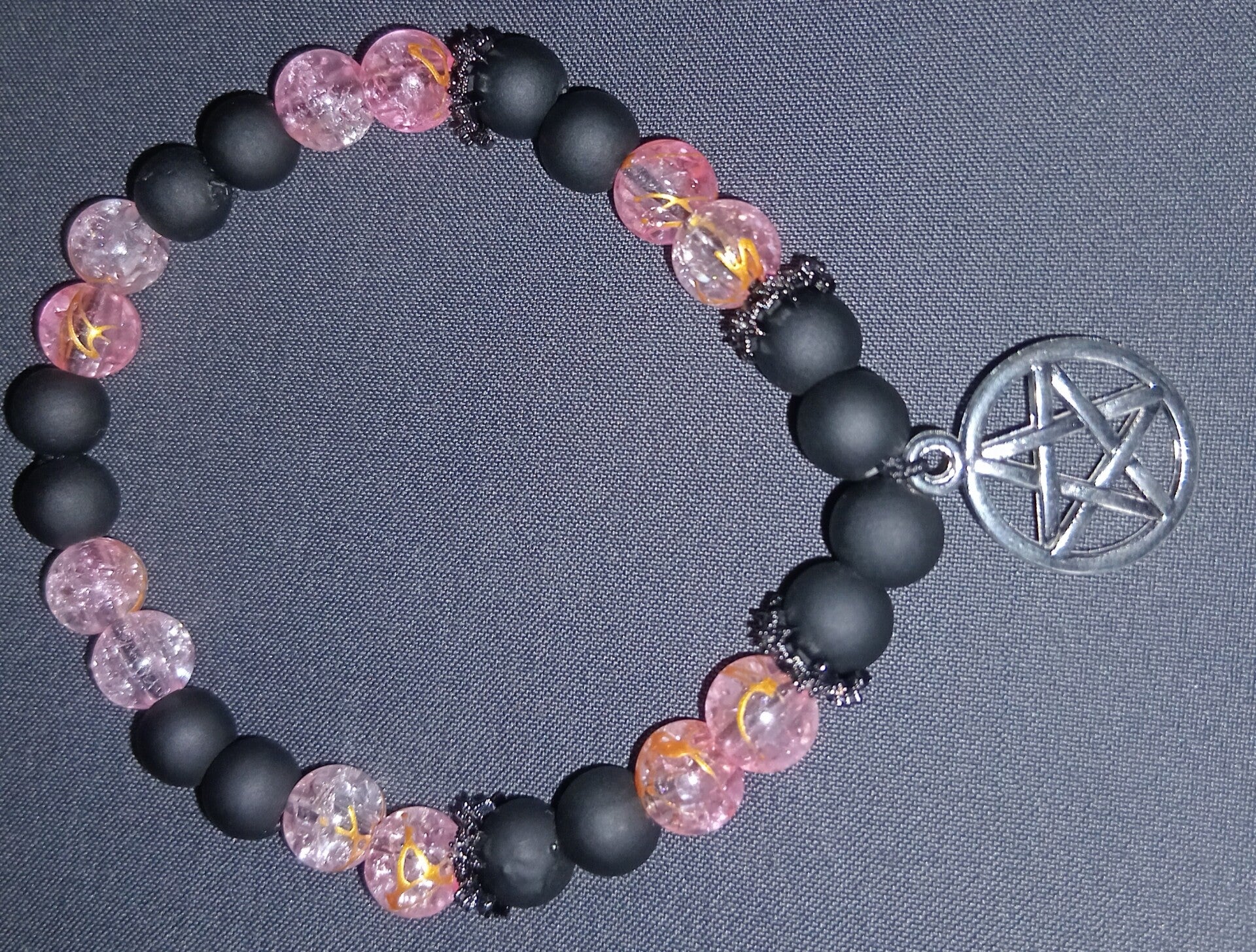 Bracelet: pink and black beads with black trinkets with small gems and a pentegram in the middle.