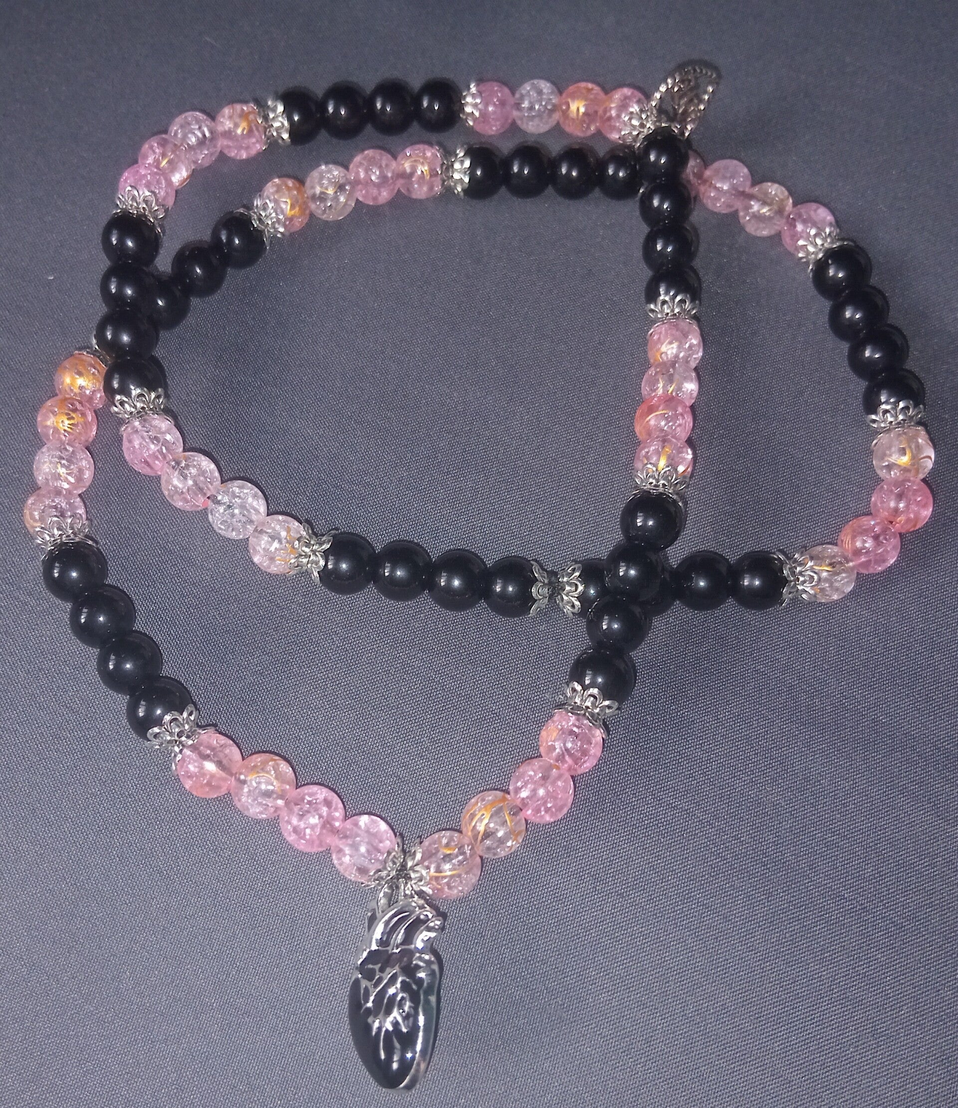 Pink and black necklace with a black heart in the middle and a love heart on the side.